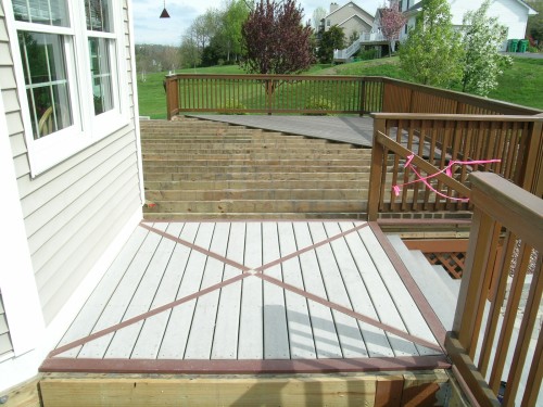 D and S Improvements Home Page Next picture Composite lumber is available in an assortment of colors, which allows for a variety of designs. This layout could be done with wood, but future maintenance would be a nightmare, since it would be impossible to repaint the edges of the boards in different colors. |