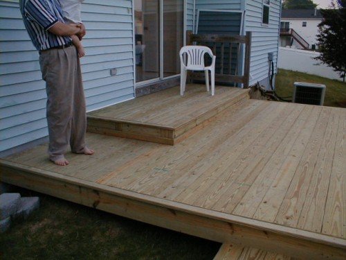The perimeter of the framing is done with doubled joists. This makes the structure stronger and allows a decorative band board to be added around the decking boards.