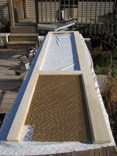 D and S Improvements Home Page Next picture This shows the grill installed. The notch is because the pipe that supplies hot water to the radiator extends just outside of the closet. The door was more easily hung while the frame was flat on the work table, but has been removed to make it easier to install the frame. |
