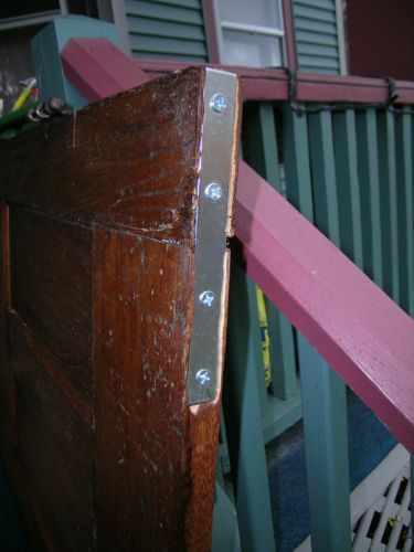 | Next picture After the glue had dried an 8 inch mending plate was screwed into the stile and rails at the top and bottom of the door to make the repair stronger. A dado 3/16" deep was cut so the plate is recessed and not visible once the door is hung. |