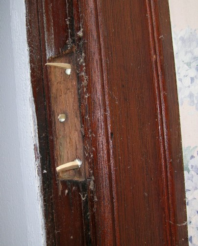 After the strips of wood are glued into the screw holes they are trimmed flush and the hinges are installed.