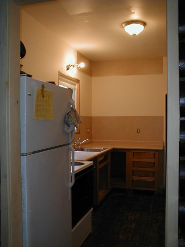 | Next picture After the walls are finished, the laminate is glued on. In this case a strip was installed above the wall cabinets to reduce cleaning and maintenance. The base cabinets and counter tops are installed, and the new sink and faucet are installed and hooked up. |