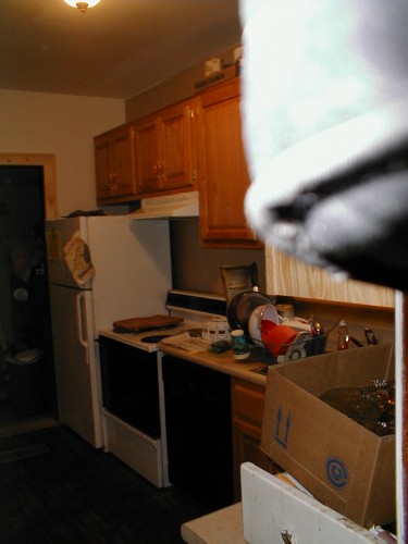 | All done. Fortunately, Don's construction skills are much better than his photography skills, and his sleeve mostly just blocks the side of the wall cabinet. The wall cabinets are up and the doors and drawers have been installed. The range hood and dishwasher have also been installed, and the new light fixture just shows at the top of the picture. The doorway has also been dressed out with new mouldings. |