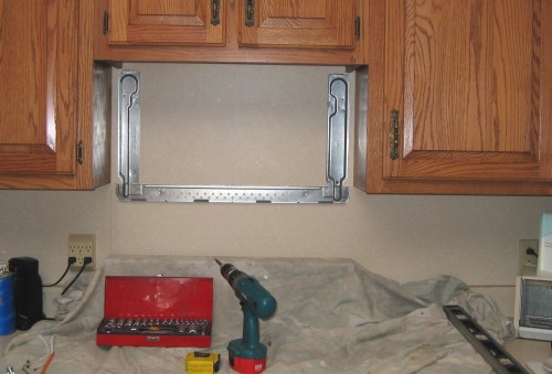 D and S Improvements Home Page Next picture First the mounting plate is fastened to the wall at all four mounting holes. Holes that line up to a stud are fastened with a lag screw. Holes that don't line up to a stud are fastened with toggle bolts. If none of the four mounting holes line up with a stud at least one of the holes across the bottom must be fastened to a stud with a lag screw. |