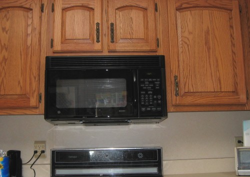 D and S Improvements Home Page Next picture With the mounting plate securely fastened to the wall the microwave is hung on the bottom of the plate and swung up against the cabinet, where it is fastened with bolts running through the floor of the cabinet. |