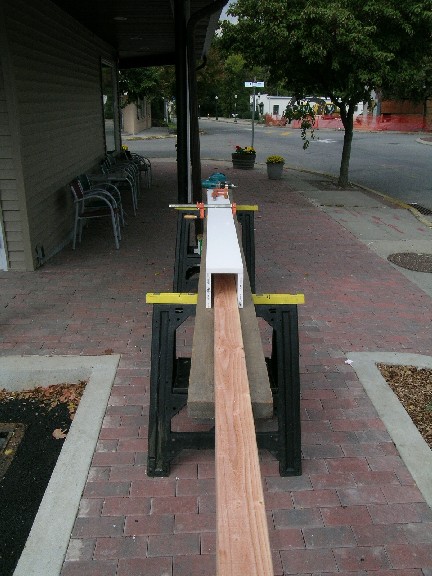 Here the third side has been partially attached. The 2 by 4 is for pushing the jig along the post as the third side is fastened. Clamping the sides against the jig keeps the width uniform.