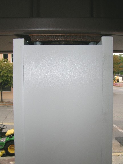 | Next picture This shows how the post fits around the plate at the top of the metal column. Two sides have to fit under the bolts in the plate and two sides fit just beyond the edge of the plate. The three pre-assembled sides are cut a litle bit short to be sure they can be put in place easily. The fourth side is then cut to length, allowing 1/8" for expansion. |
