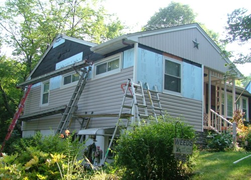 | Next picture Once the prep work is done the next step is to install flashing over the doors and windows. Next is installing leveling board, (that's the blue stuff in this picture). Leveling board adds a bit of insulation, but its main purpose is to even out irregularities so that the vinyl will lay flat. |