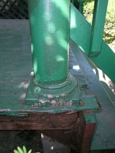 | Next picture There was some rot at the bottom of one column. The mystery was in how much rot, and how much work was required to fix it. From what was initially obvious we were hoping it might be as easy as replacing a few of the decking boards, but removing the trim board on the side of the deck made it obvious that at least some of the framing would also need to be replaced. |