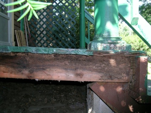 | Next picture Here's another look at the obvious damage after removing the trim board. The camera was close to level when the picture was taken. The deck has a good bit of pitch, with the front a couple of inches lower than the back. |