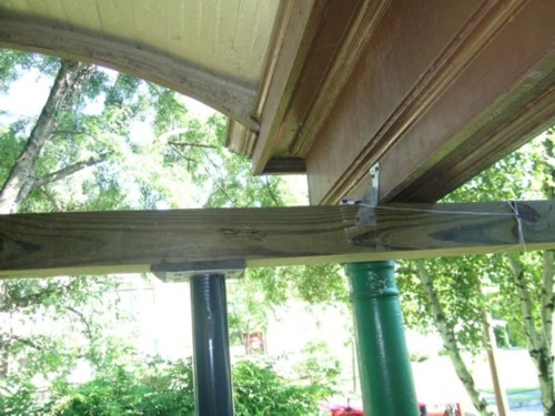| Next picture Here we can see that the 4 by 4 beam has been secured to the roof with a metal tie. The adjustable post that's being used to raise the roof will have to come out, and we want the beam to stay there until the roof has been brought back down after the job is done. The string on the right has a plumb bob that will show how much the roof has been raised. Measuring the distance between the roof and the deck might not be accurate because if the rotted framing compresses as the roof is lifted the deck might move down. That's not a real problem, but the roof should only be raised enough to unweight the columns and remove the bases, so we want an accurate measurement. |