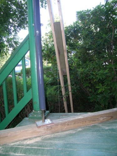 | Next picture Here's the bottom end of the adjustable column. We've put it on another beam because we want to transfer the load to the framing at the front and back of the porch. The roof has now been raised, so posts have been added to support the roof after the adjustable column is removed. |