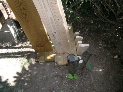 | Next picture Here's the bottom of the temporary support posts. We need enough bearing surface that the posts won't sink into the ground, so we've put them on some pieces of 2 by 12 boards. The posts are screwed to the boards and the wedges will keep the boards from sliding out from under the load. |
